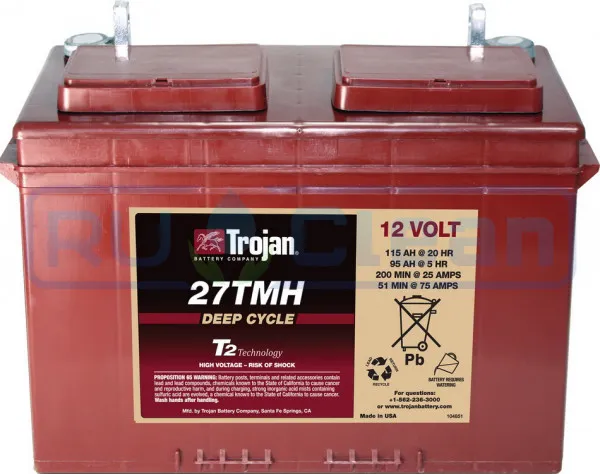 Аккумуляторная батарея Trojan 27TMH с жидким электролитом применяется для подъёмно-тяговой, поломоечной, грузовой техники и других электродвигателей. Прочный корпус надёжно защищает батарею от протекания электролита.
