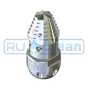 Вращающаяся каналопромывочная форсунка PA SPa RR-TF для профессионального использования. Высокопрочный нержавеющий корпус, коэффициент потока 30, подключение 1/2" гайка, бой назад и вперед.