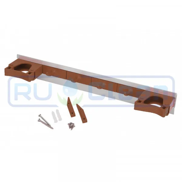 Настенное крепление (направляющая с крючками, резиновые зажимы и боковые заглушки) 4 крючка и 2 зажима. Крепление со сменными комплектующими, предназначено для настенного хранения инвентаря на пищевых предприятиях.
