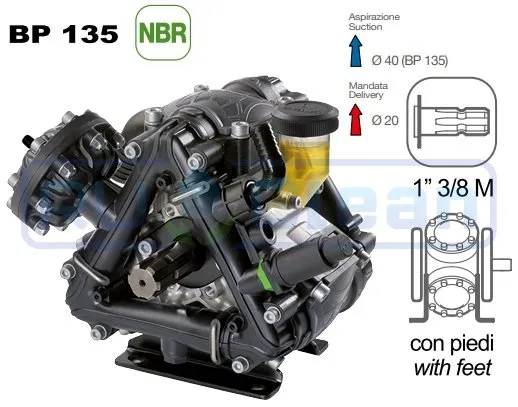 Мембранный насос марки COMET® серия ВP135 рассчитан на подачу воды под давлением до 20 бар, относится к насосам низкого давления. Успешно используется в агропромышленном комплексе для полива и орошения, а также широко применяется в коммунальной технике. Конструкция и используемые материалы позволяют перекачивать агрессивные химические вещества, используемые в сельском и коммунальном хозяйствах. Насосы оснащены торцевыми частями и коллекторами из техно-полимера, для максимальной химической устойчивости.