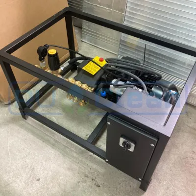 Привод насоса высокого давления - однофазный (220В), асинхронный, 4х- полюсной электромотор, с частотой вращения 1400 об/мин, мощностью 2,9 кВт. С данным силовым агрегатом аппарат способен подавать воду под давлением 150 бар и потоком воды 600 л/час. Система управления автомойкой с функцией мгновенного автоматического отключения (Total-Stop). Когда в процессе работы оператор отпускает курок пистолета, то регулятор давления переводит насос в режим байпас, и в этот же момент автоматика выключает электродвигатель.