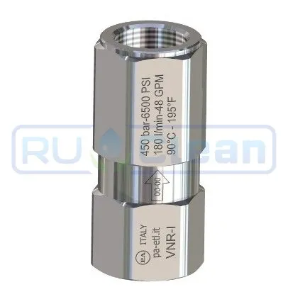 Обратный клапан высокого давления PA VNR-I из нержавеющей стали, материал уплотнения - Viton. Подключение с двух сторон с внутренней резьбой 1/4". Максимальное давление 450 бар.