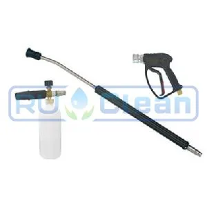 Пенопистолет (пенокомплект) – это насадка, которая работает от аппарата высокого давления и позволяет наносить химические средства в виде пенного раствора на различные пoверхности, в том числе труднодоступные. Максимальная высота ограничивается характеристиками аппарата высокого давления и может достигать до 100 метров. Пенокомплект состоит из трех частей: пеногенератора, струйной трубки и курка с быстроразъемным соединением. Курок подключается к шлангу высокого давления вместо штатного пистолета.