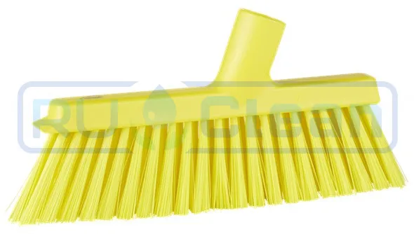 Легкая и особо эффективная щетка для подметания как сухого, так и влажного мусора. В рисунке ворса используются щетинки двух разных диаметров. Внешний ряд щетинок состоит из более мягкого ворса, чем средний, что позволяет не пропустить ни соринки. Ворс у края-скребка расположен под углом, что позволяет выметать мусор у самой стены и из углов, а также из-под рабочих столов и т.д. В конструкции предусмотрен эффективный край-скребок для оттирания с поверхностей присохшей грязи.