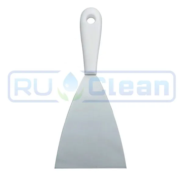 Скребок с рабочей пластиной средней ширины из нержавеющей стали. Подходит для удаления прилипших, присохших