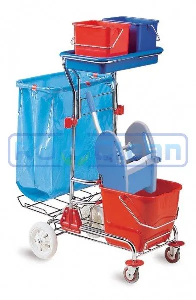 Уборочная тележка Euromop Togo имеет хромированную раму, на которой располагаются 2 маленьких ведра объемом 9 л (красное и синее), 1 большое ведро (красное) объемом 15 л с механическим отжимом, 1 лоток (синий) под маленькие ведра. На раме также находятся 2 держателя-фиксатора для уборочного инвентаря (швабры), держатель мешка для мусора (рассчитан на мешок объемом до 120 л).